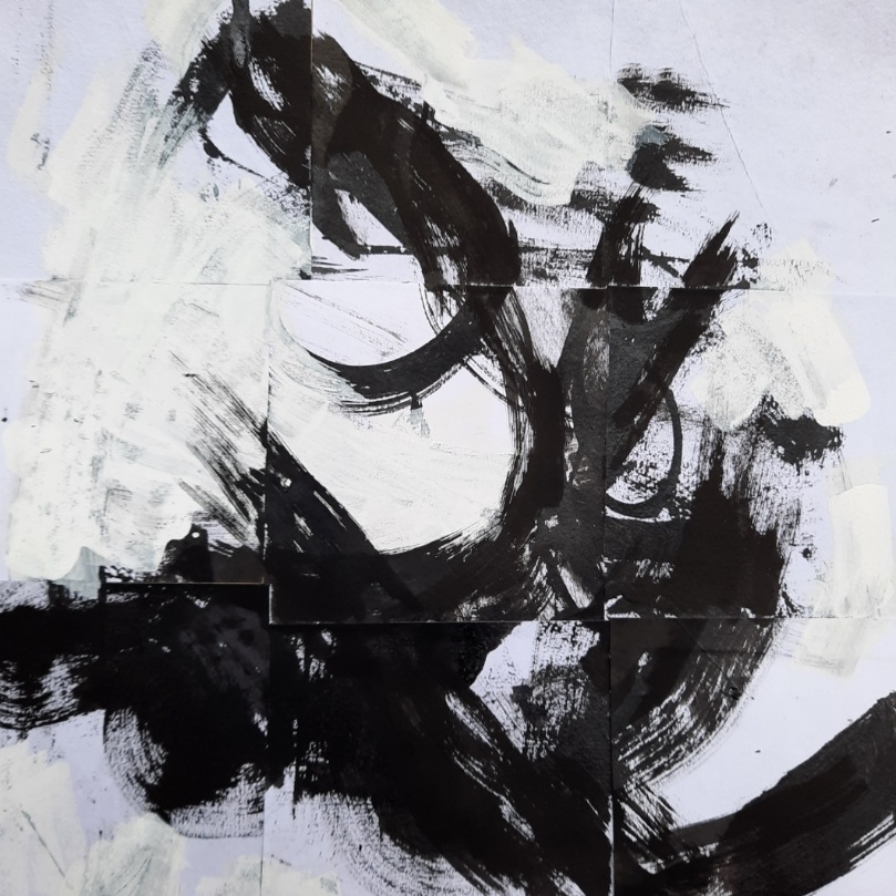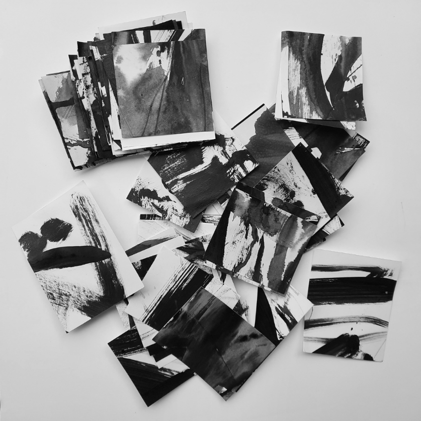 Something else I’ve been trying (thanks to Jenny Nelson) is an exercise in mark-making that leads into design and composition. You create dark marks of any sort, freely and randomly, spreading them around the paper. Then the paper is cut up into squares (I like the idea of just tearing it up too).