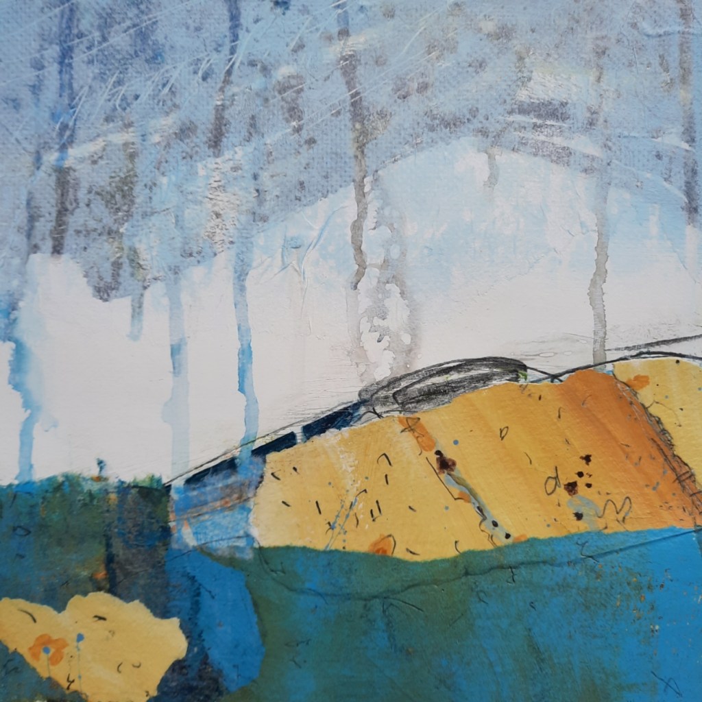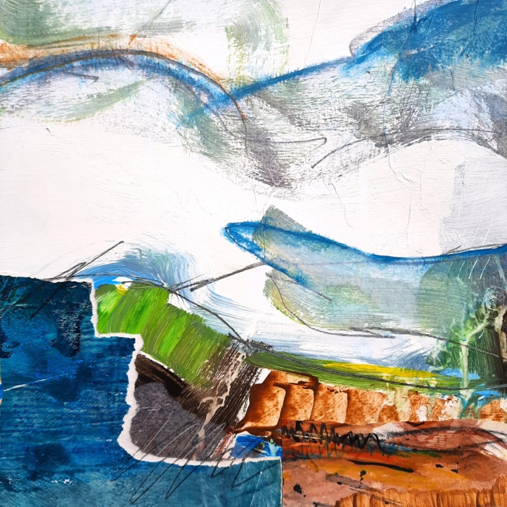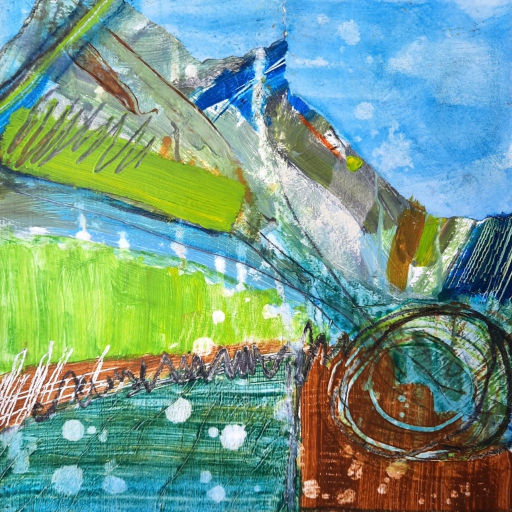 “Switchback”, below, is the most successful I think. It’s going to be the inspiration for another series shortly. I like the sky and the variety of marks and shapes that make up the “land”.