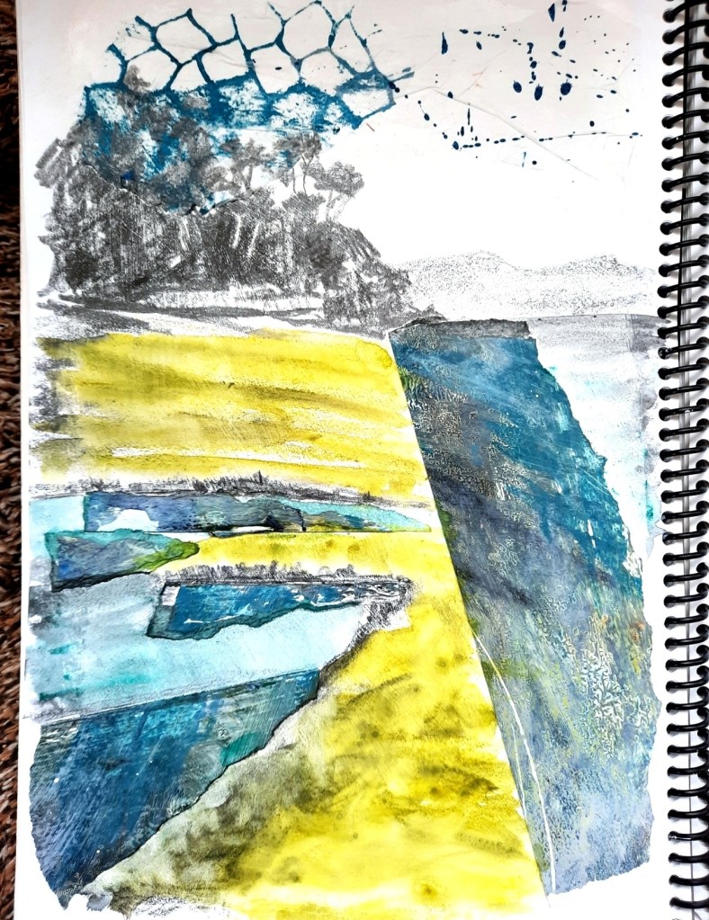 What if I throw down some collage before I start my plein air sketch? So I chose some collage paper I thought was suitable and glued it down. The “what if” became a “wonder if”. I wonder if this idea will take me somewhere new?