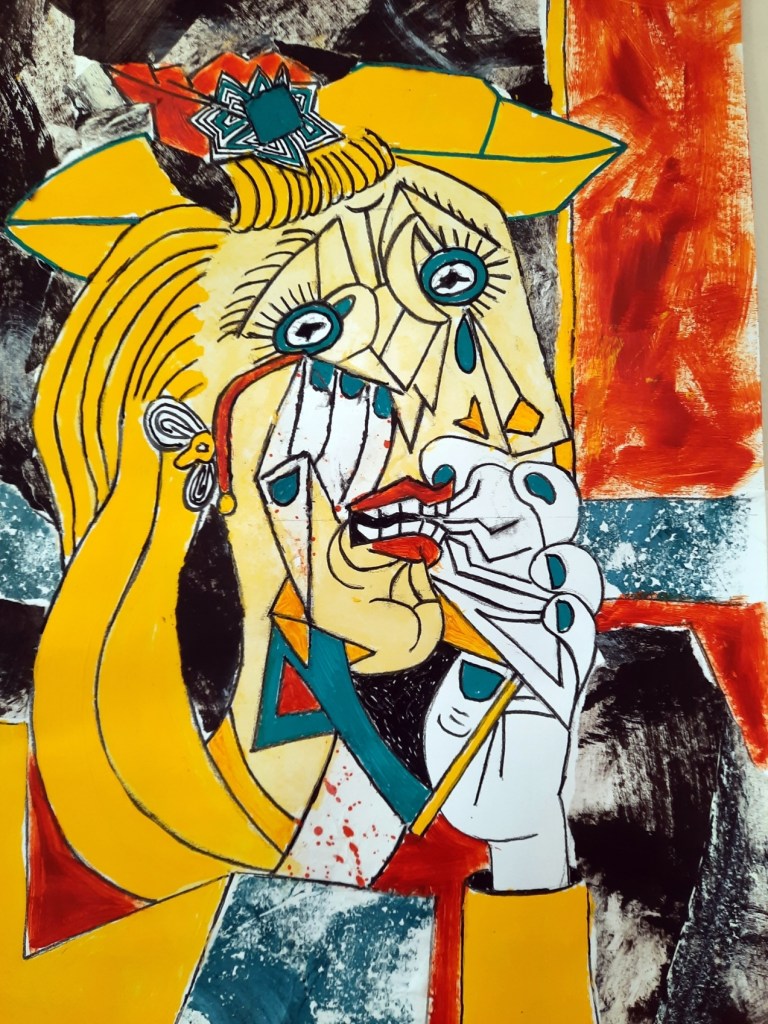 It was a great idea, something different, and very interesting to see the variety of approaches that were taken. Mine is a mixture of collage and paint (below). It’s after one of Picasso’s Weeping Woman paintings. Others used materials from their area of expertise, such as fabric and wool. One was entirely collage, another completely monochrome, everyone’s choices varied greatly. It really got some creative juices flowing. Lots of fun! Some “Weeping Women” looked positively distraught, others less so.