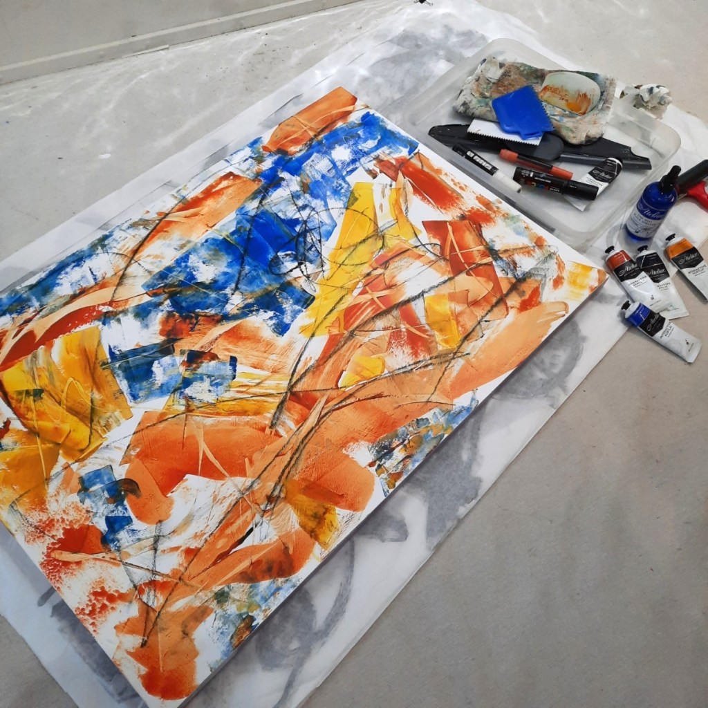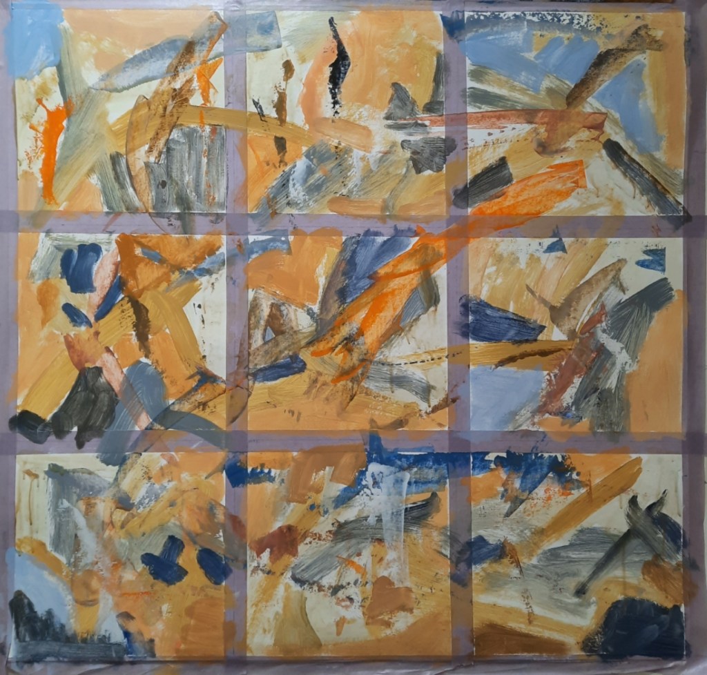 The third thing I’m doing is working on nine small square images that started as a place to use up paint from course exercises. The plan is to create layers here too and include some collage. Rather than start with a structure in mind, these littlies are at the mercy of impulse. Each time I work on them, I look to see what’s there, turning them all four ways to explore possibilities. Sometimes, there are things that you can act upon, but just as often, there’s nothing to prompt any action. With those, it’s a case of plough ahead with more playful mark making or collage, and the process repeats.