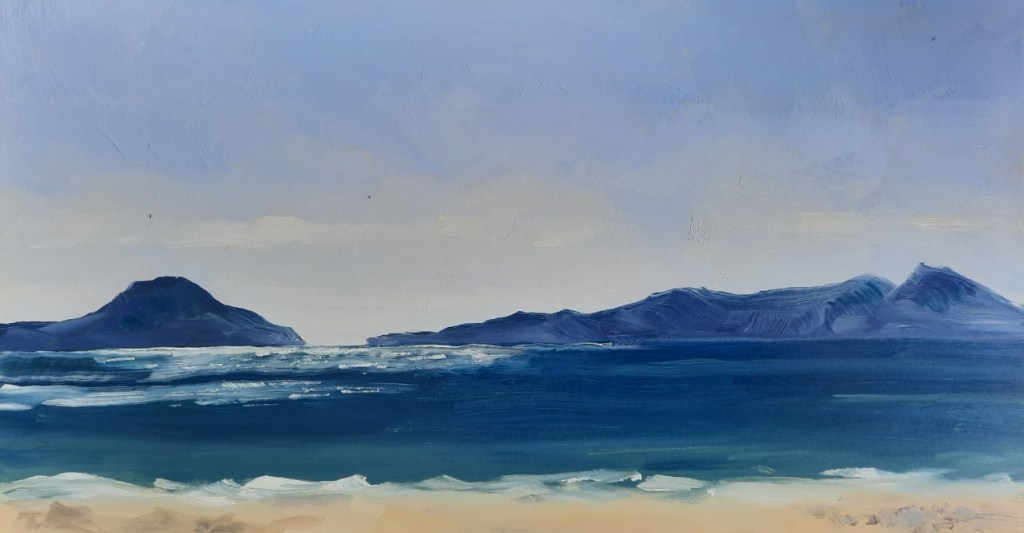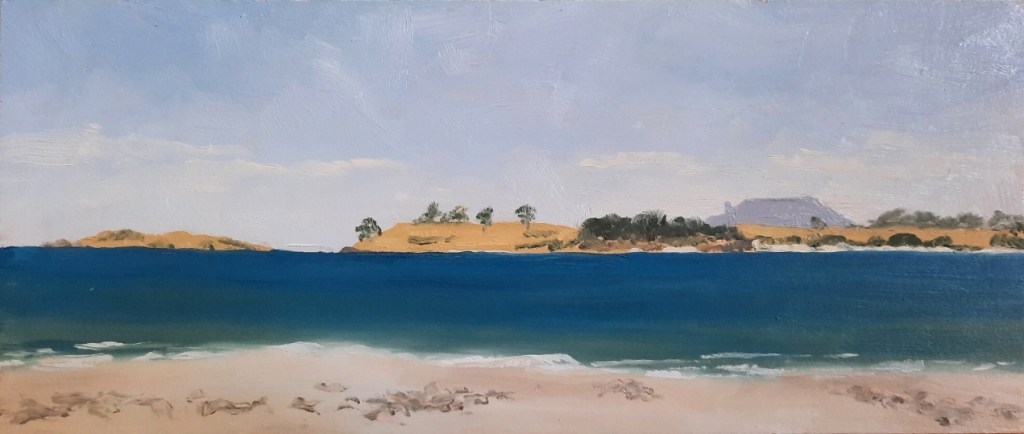 This view is looking towards Maria Island across the bay and a lovely yellow grassy point. I like the effect that the dry grass colour has in a painting. It relieves the green and brightens things up.