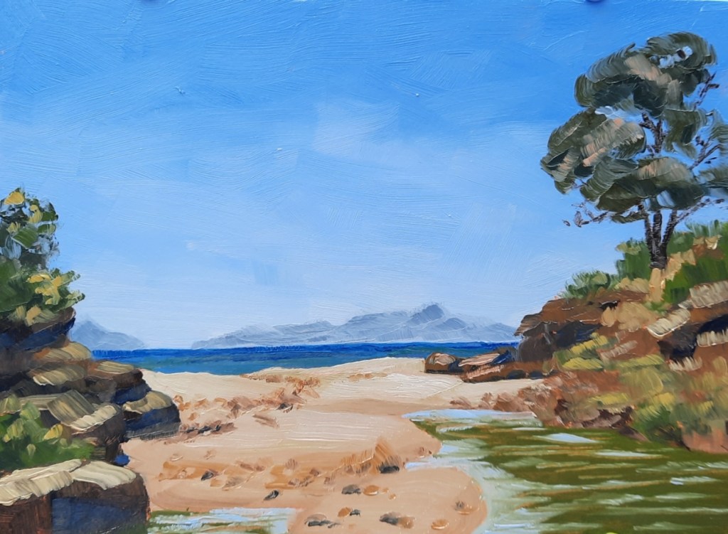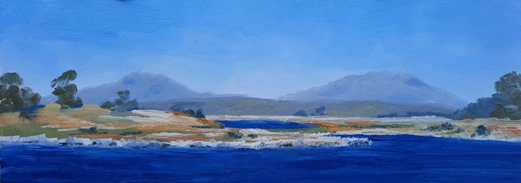Still feeling enthusiastic when that one was finished and after checking with my artist friends, there was time for another quick one! So, it was back to my shady studio by the sand. This time, looking the other direction, across the water to Freycinet National Park. I could see The Hazards, and the sun was sparkling on the water. Special! But, with less than 30 minutes, it was a case of do what you can quickly.