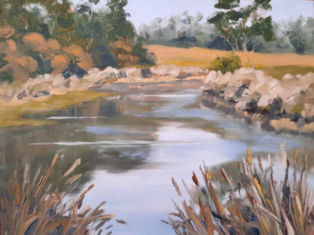 The next day, we began with painting Saltwater Creek in Swansea. This one tested me a bit. I decided to leave out the building’s, but later thought it was a mistake. Plus, the foreground grasses proved annoying. It’s a good lesson, having things not going well. It happens often, and keeps your feet firmly planted in reality!