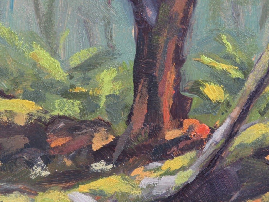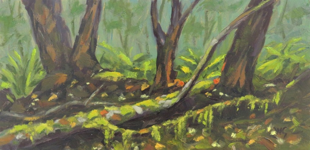 To start the brush moving I decided to check out the area where my friend and I were camped. Only a few metres into the forest some good shapes presented themselves. Also, due to the gap in the trees (caused by the road), the trees behind my three major darks were lit by sunlight. The ferns on my side of the road were nicely sunlit too. With the bright mossy greens and the colourful ground litter, the scene was set.