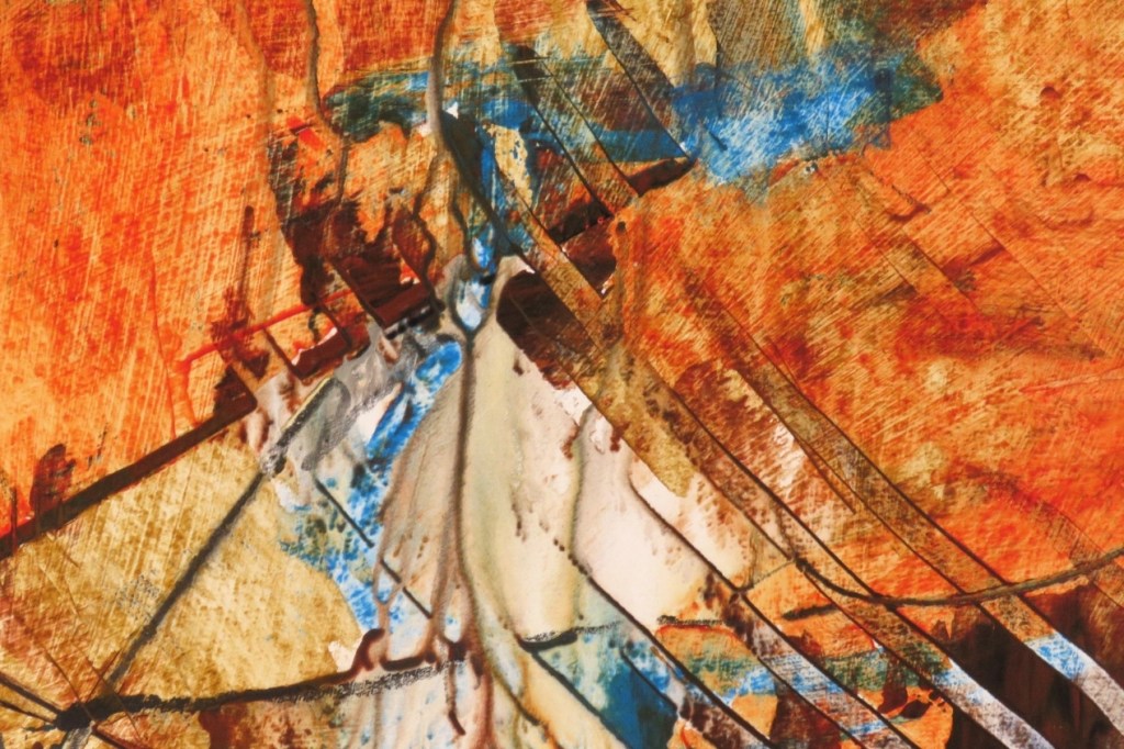 “Catchment” is a bright, strong image that will make viewers want to get up close and personal. Sometimes, part of an image that you wish wasn’t there becomes the reason for it’s existence. That’s what happened with the “water” in “Catchment”. I love how a painting can lead you to it’s final state and you don’t know it’s happening! It definitely creates one-off works because they just can’t be recreated. I hope this painting can lead you on a journey too, with it’s various marks and textures.