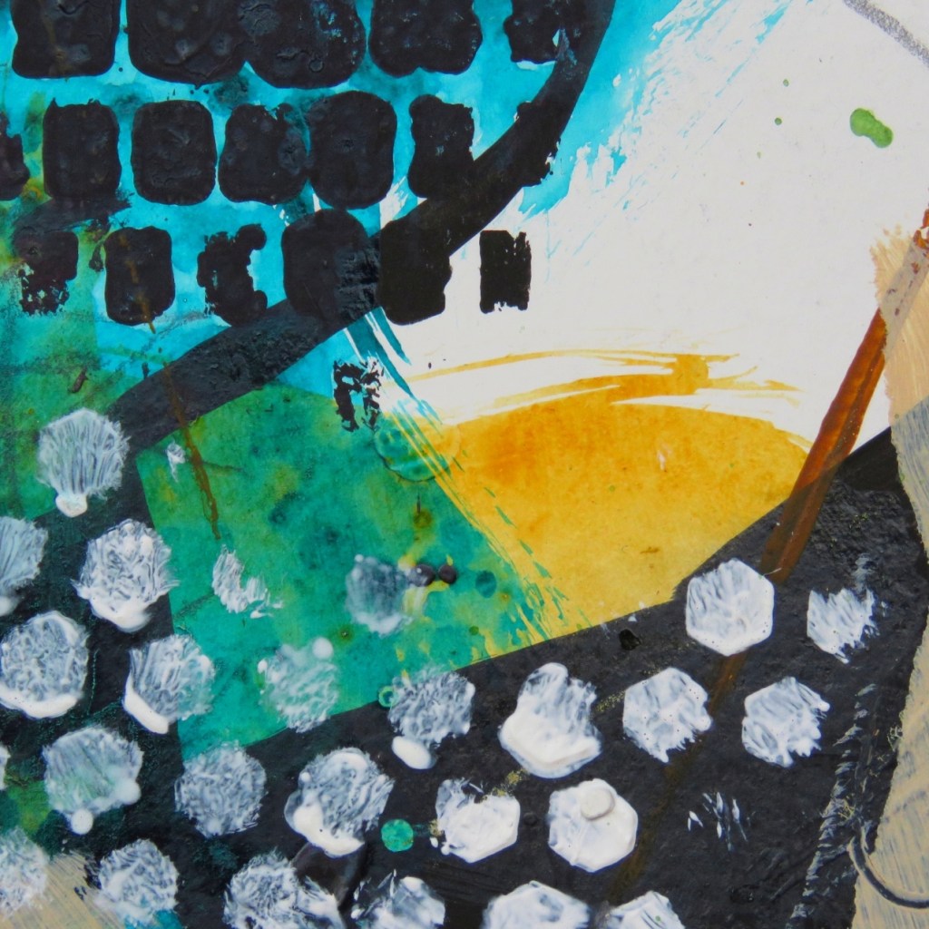 This series of musical themed paintings have lots of energy. Splashes of yellow and turquoise bring colour, while patterns and drawing enliven and provide rhythm and interest. In each work, marks were found that prompted memories of various musical themes or feelings.