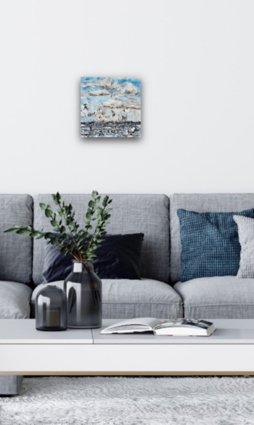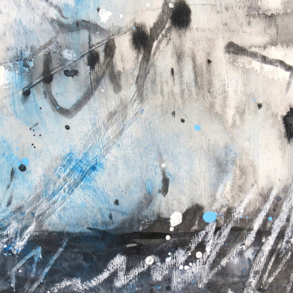 Collaboration is a plein air image (painted entirely out of doors). My inspiration was the interaction between the sea and the atmosphere above and the way it might affect my interpretation of the horizon. I began the painting without an end point in mind and let myself be guided by what I felt. The blue, black and white lend themselves to the atmosphere that can be created when looking across water to the horizon.