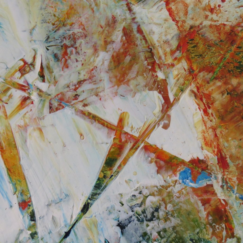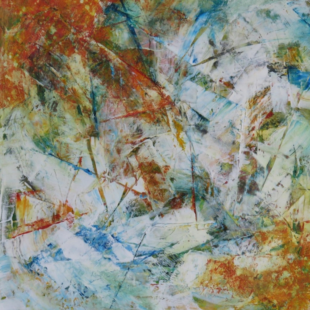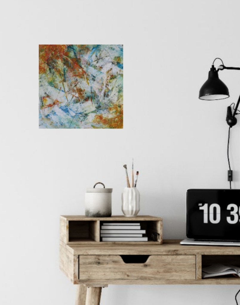 There are many layers in “Curious” creating it’s rich textured surface. It has a vibrant, active feel about it, created by the lively application of paint. The linear marks give it movement. Texture plays a role here too providing further interest for the viewer.