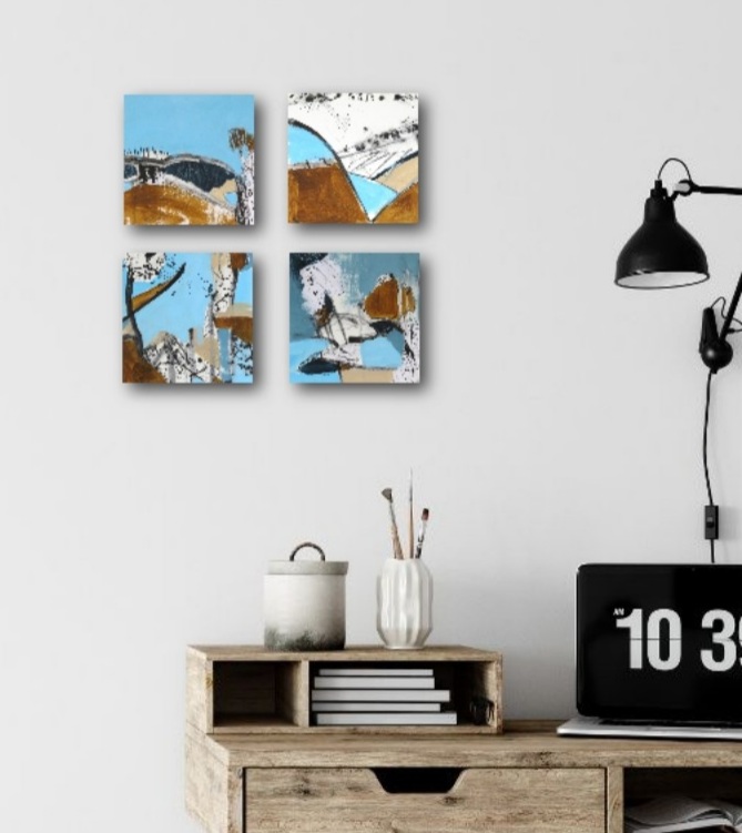 In this painting I was reminded of the way some hillsides are so steep as to defy you walking up the slope. Also, in this case the marks I made seemed to defy logic as I endeavoured to avoid a cliche landscape look. When I work intuitively like this, marks occur that definitely aren’t logical. It’s exciting and inspiring! I guess these hills are “high pasture”! There are seven other images in this series that can be mixed and matched to display in groupings.