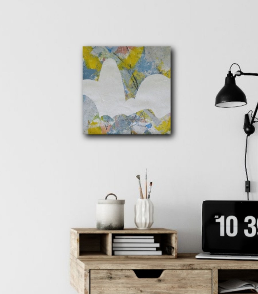 “Dreaming” certainly has a floaty feeling. The colours and shapes bring to mind fantasy or a lightness. I like to think of the central white section as that part of our dreams that we can’t quite recall, or have forgotten. This was a good dream! What would have been happening I wonder?