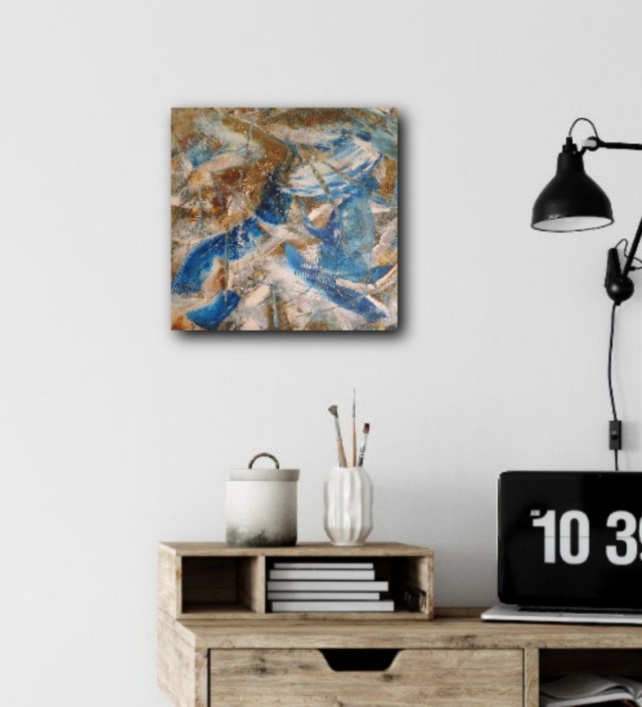 “Exploration in Blue and Yellow” is unframed. You may choose to arrange framing yourself, or it can be professionally framed on its way to you with Bluethumb’s trusted network of framers.