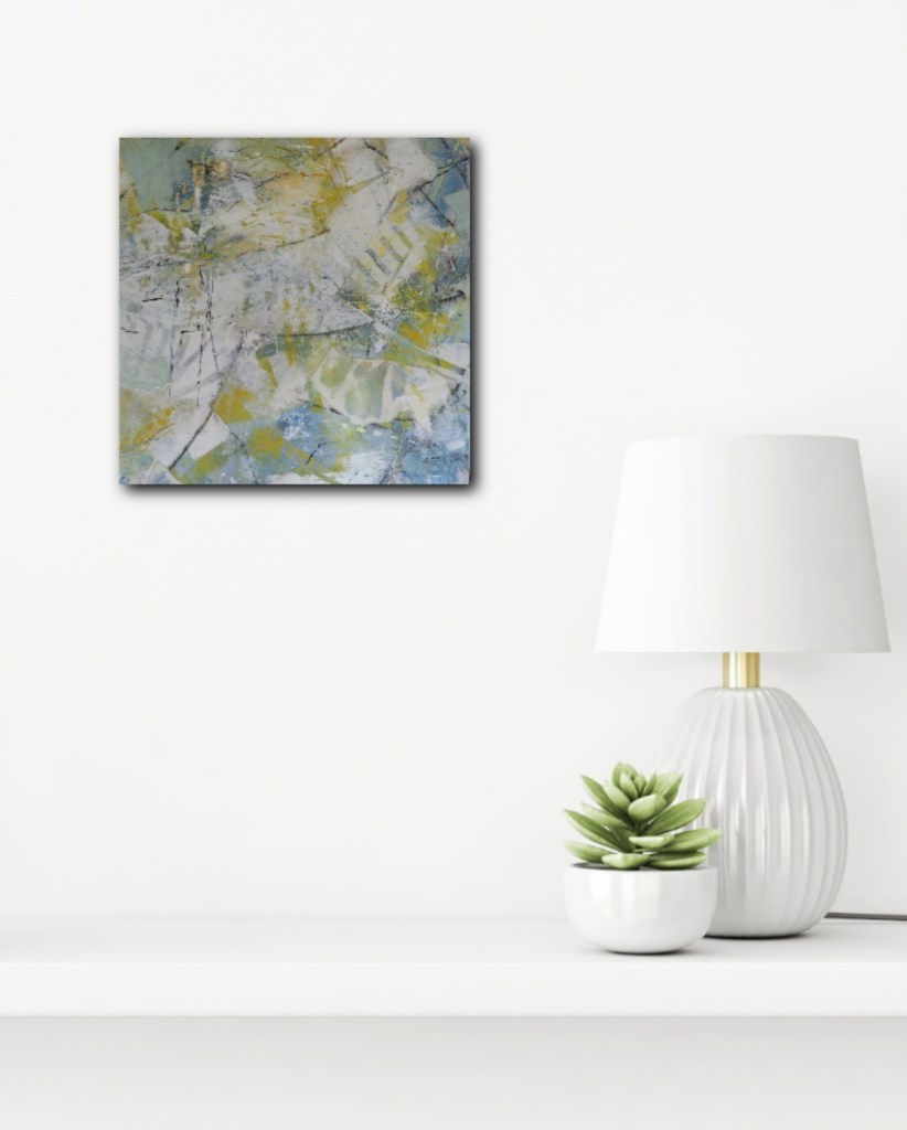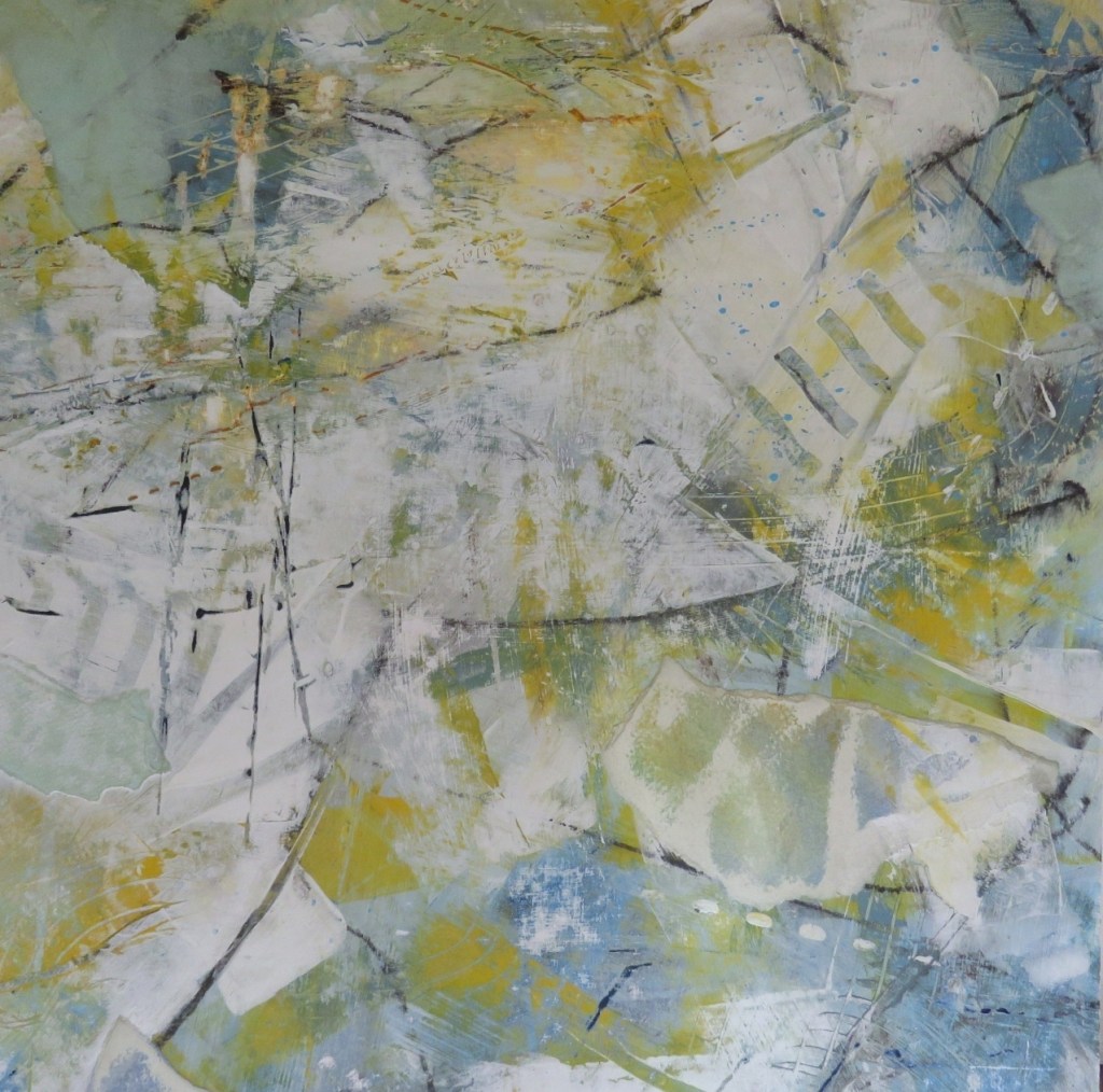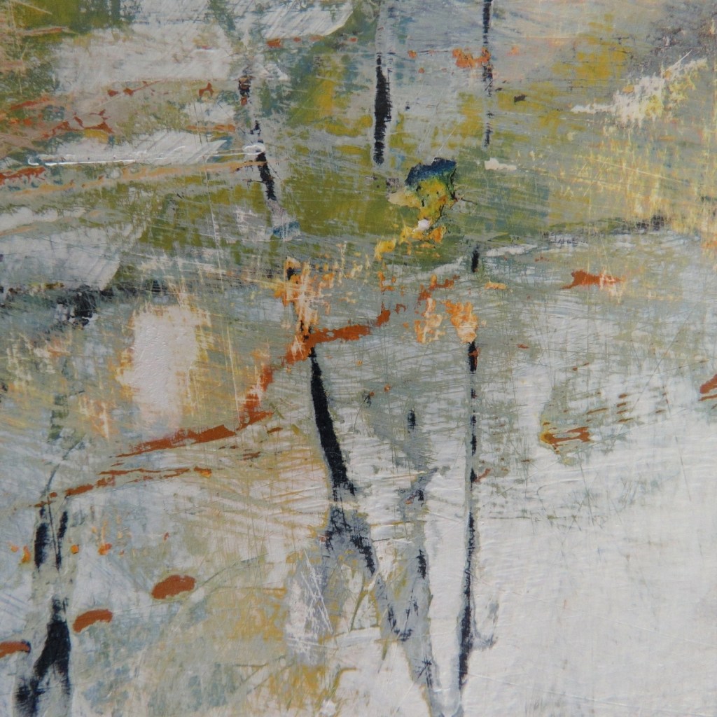This painting developed in layers, as does frost. The last layer of paint I applied made me think of frost. Then I remembered how it sits on top of what it forms on and you can scrape it off to reveal what is underneath. Thus, I decided to sand back that last layer and reveal parts of what lay below. The name really lends itself to this painting. The marks and colours are very reminiscent of frosty mornings.