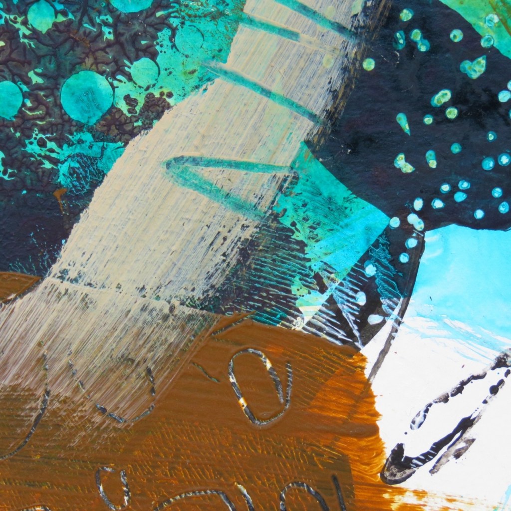 This series of musical themed paintings have lots of energy. Splashes of yellow and turquoise bring colour, while patterns and drawing enliven and provide rhythm and interest. In each work, marks were found that prompted memories of various musical themes or feelings.