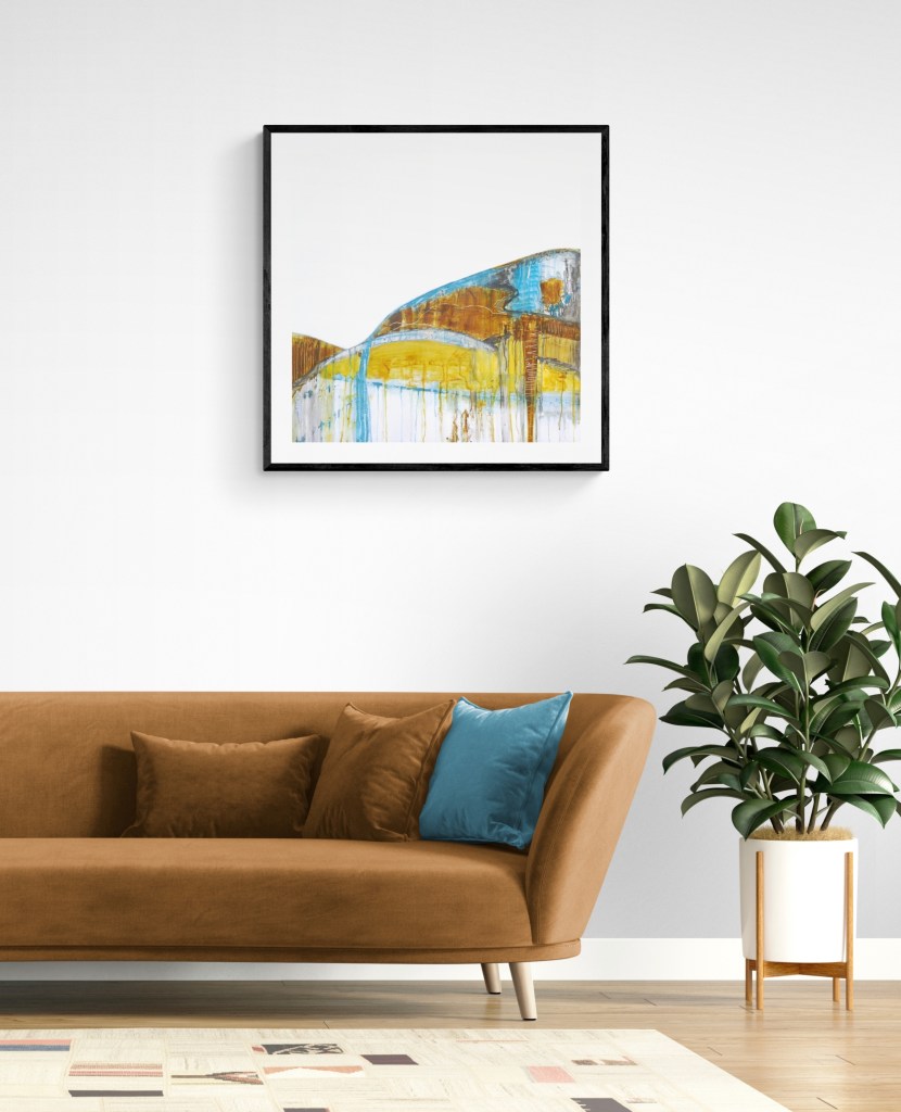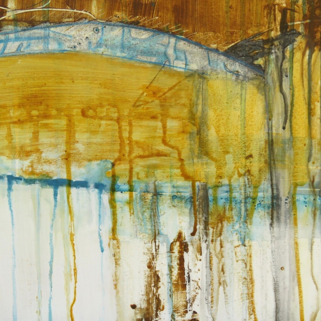 “On the Face of It” is a playful abstract interpretation of landscape with bright areas of turquoise. It began as random linear marks and as I painted a landscape emerged. My task was then to define that landscape in an abstract way. to give it texture, colour and interest. These types of paintings give you complete freedom to follow your intuition, wherever it may lead.