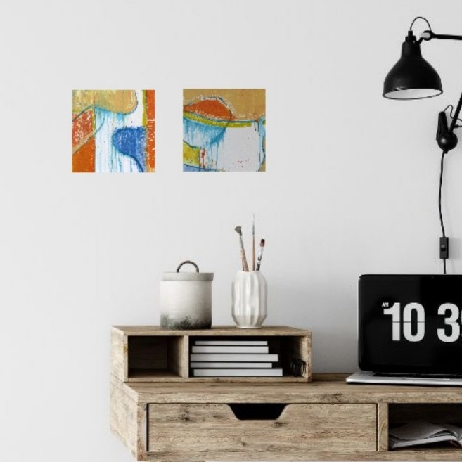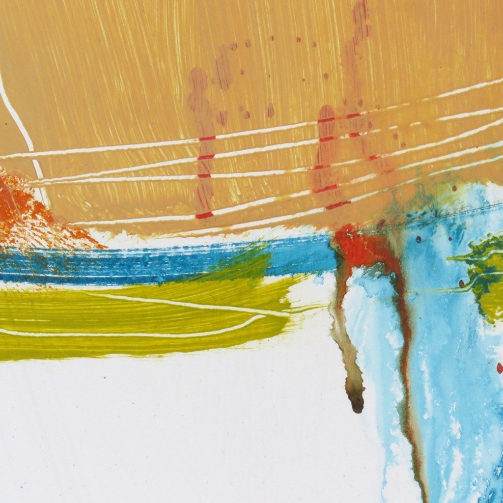 This series of two small landscape inspired paintings was a joy to create. Can you feel it? They’re an exercise in play and chance. Both works are cheerful and lively with interesting textures and details. I chose these colours for their compatibility and bright nature. My paintings lead me to their conclusion, not the other way around. Titles present themselves based on each work’s appearance and how I feel about each one when we reach the point where I’m happy to stop.