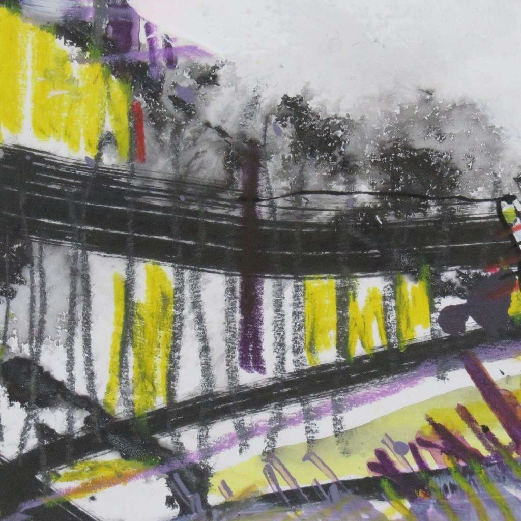 In this fun series of four paintings I explored using drawing as the major element. Randomly generated or drawn marks are the starting point for these four works. It’s a great way to start and keeps me working freely and expressively for longer. The bright cheerful palette of violet, yellow and a touch of red creates a fun mood. A variety of textures and marks add further interest and movement to these imagined landscape paintings. Can you sense the fun I had creating these works? They are quite unusual. I’m sure they would be a talking point when hung.